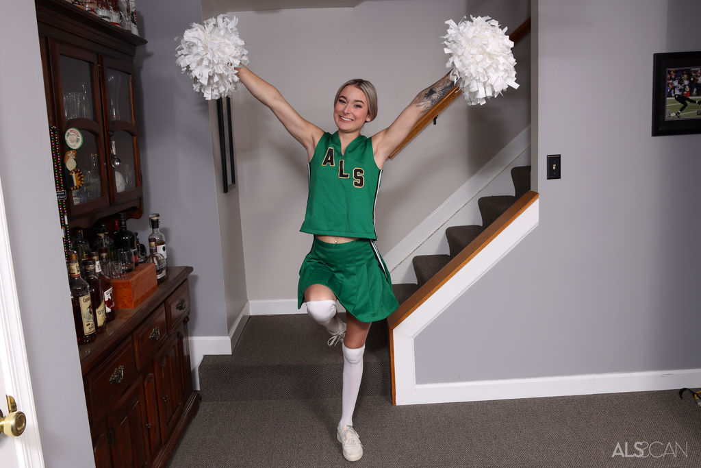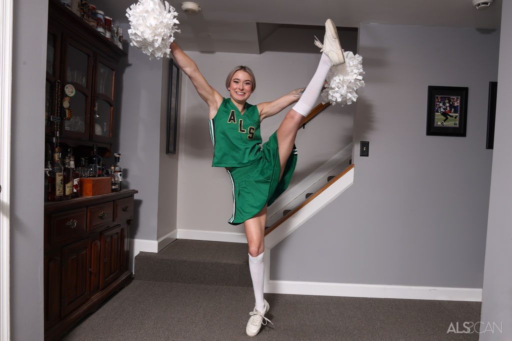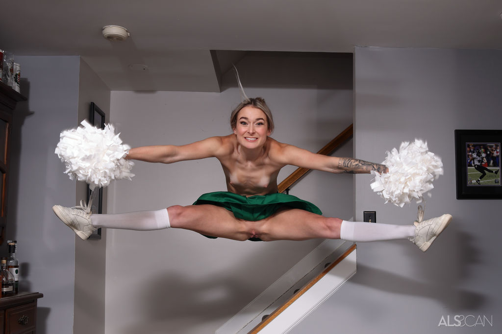 Flat-chested blonde cheerleader spreading and toying her shaved pussy from