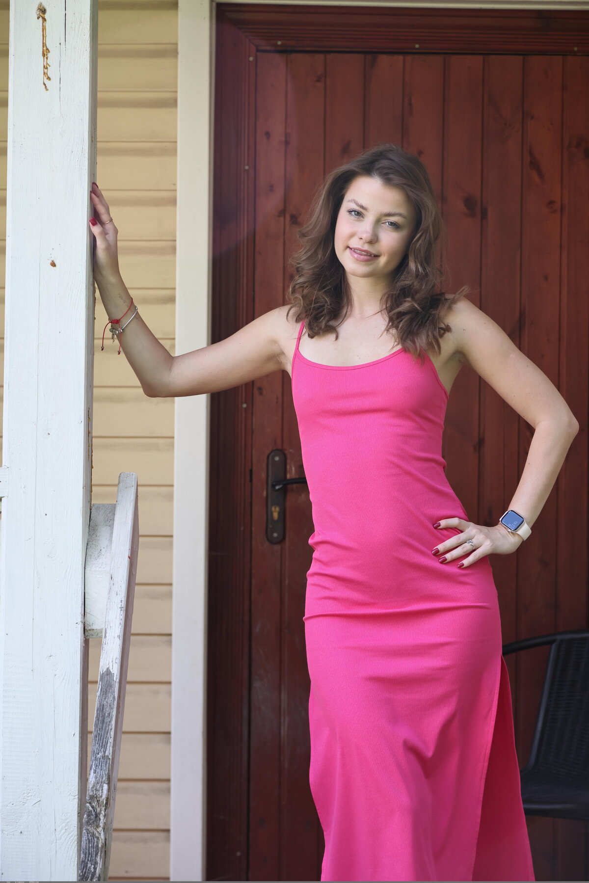 Cute shaved brunette takes off her pink dress on the balcony from